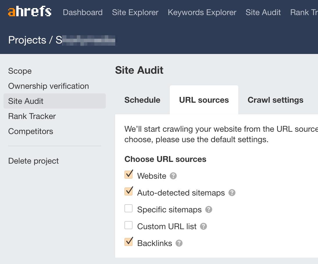 Ative “backlinks” como fonte enquanto configuro o seu rastreamento. Isso permitirá que a ferramenta Site Audit encontre páginas excluídas com backlinks, mesmo que não haja links internos a funcionar para as páginas do seu website.