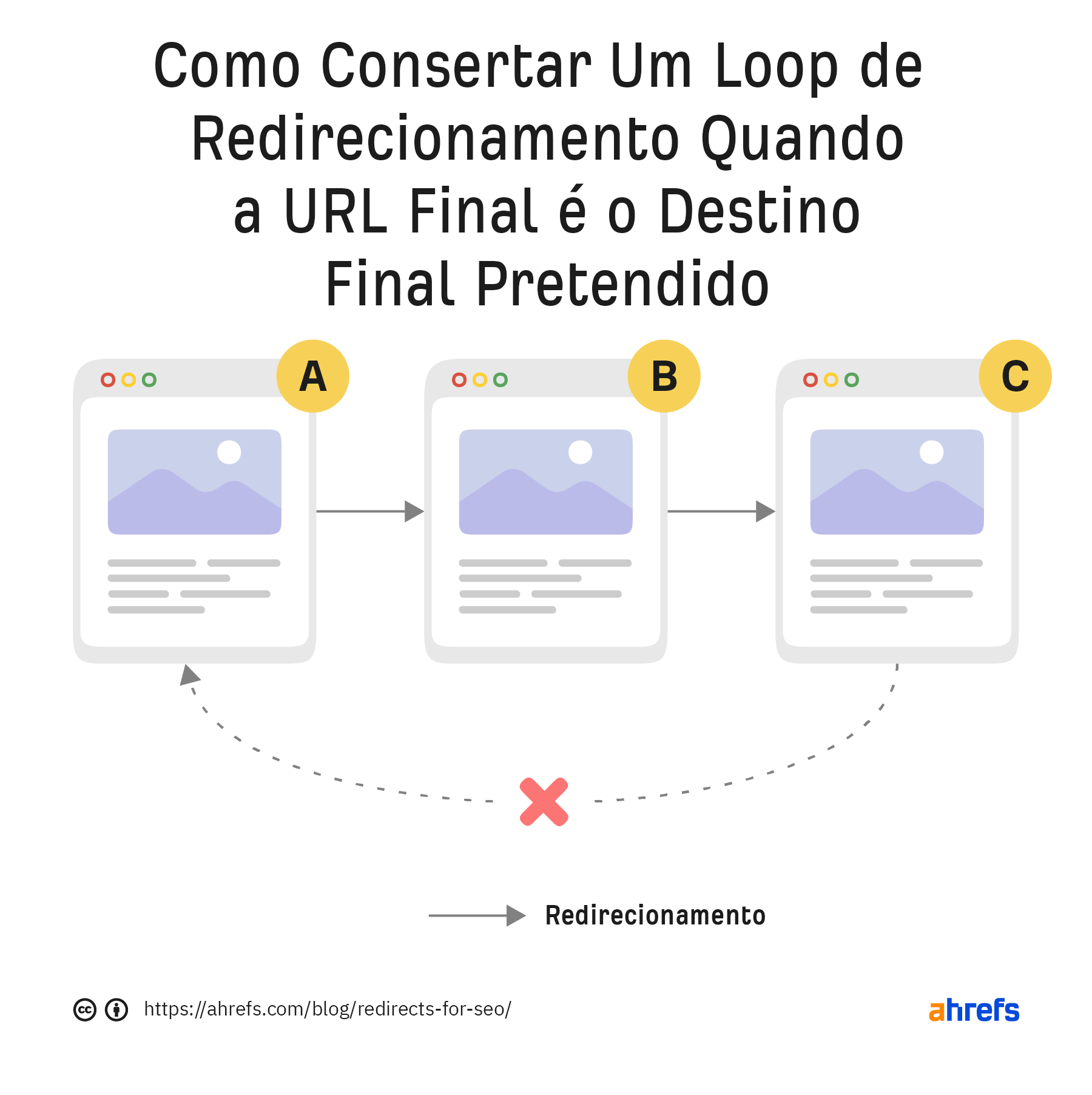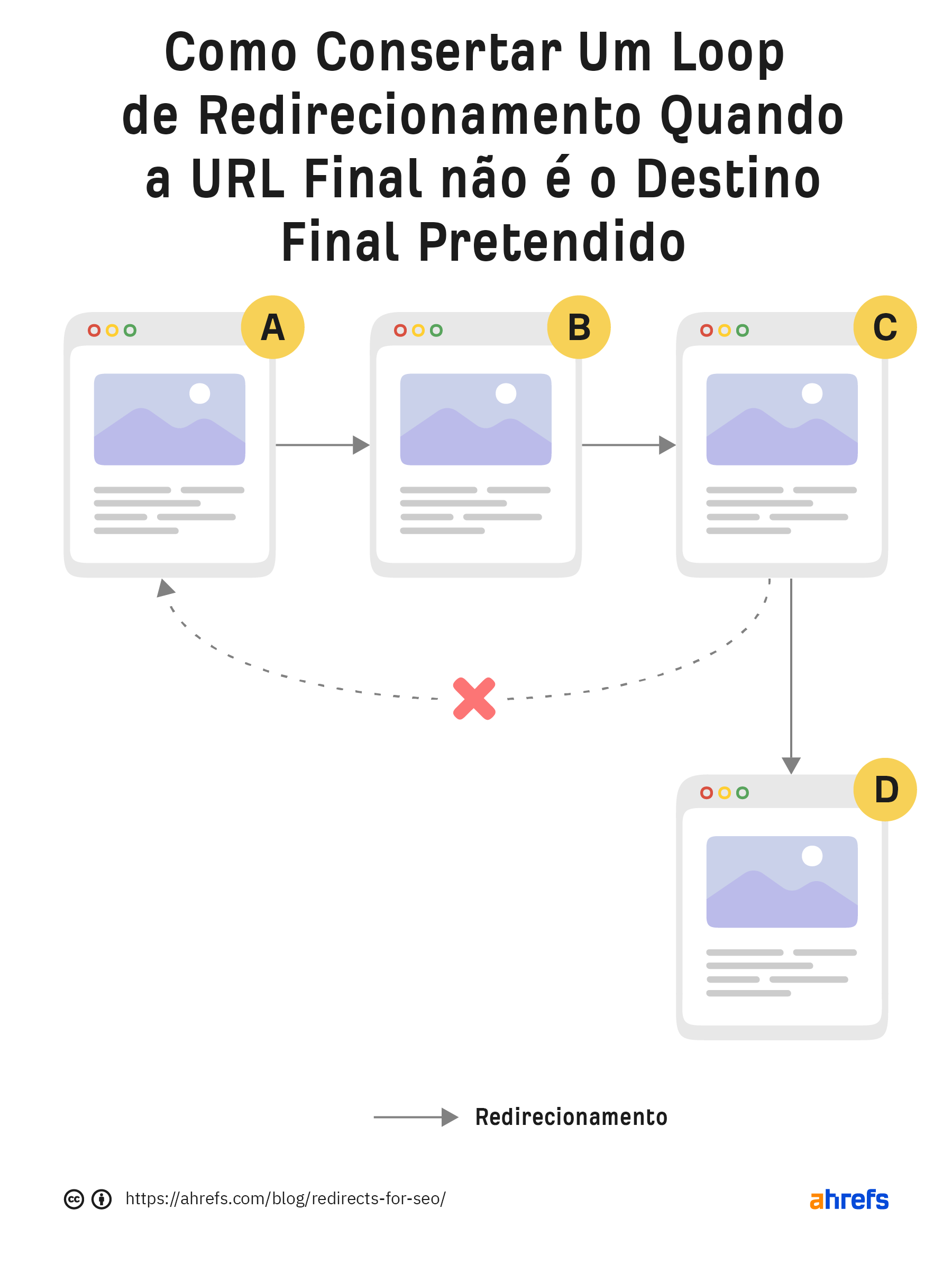 Loops de redirecionamento são loops infinitos que ocorrem quando um URL redireciona para si mesmo ou quando um URL, dentro de uma cadeia de redireccionamento, redireciona de volta para um URL anterior da sequência.