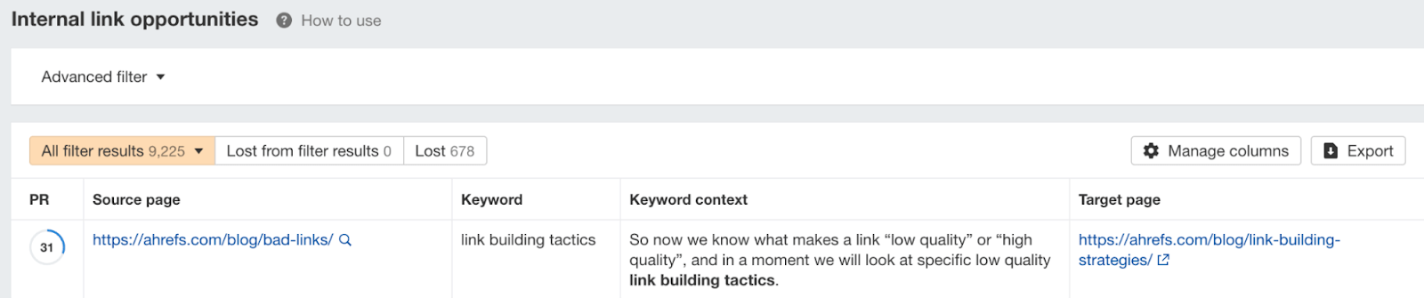 Por exemplo, pode ver acima que ele recomenda que vinculemos internamente a frase “táticas de criação de links” no nosso guia para links maus incluído na nossa lista de estratégias de criação de links.