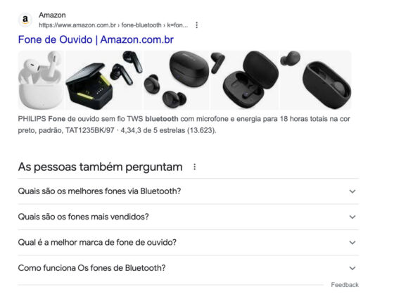 Aqui está um exemplo que mostra como as SERP se parecem de hoje em dia numa pesquisa de “fones de bluetooth”.