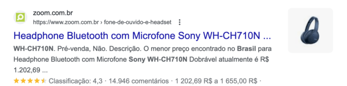 Marcação de esquema diz respeito ao código que ajuda os motores de busca a entenderem melhor e mostrarem suas páginas nos resultados de pesquisa. Adicionando marcação de esquema às suas páginas de produto pode ajudá-las a obter rich snippets como este: