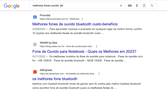 Veja este breve exemplo de uma palavra-chave informativa para “fones que bloqueiam barulho”; isto é, em inglês, “noise canceling headphones”.