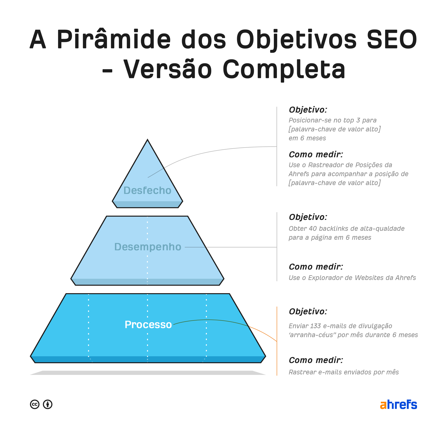 Pode imaginar os seus objetivos de SEO como uma pirâmide, com o resultado no topo e objetivos mais pequenos nos níveis mais abaixo. A ideia é começar pelo fundo e trabalhar para ir subindo.