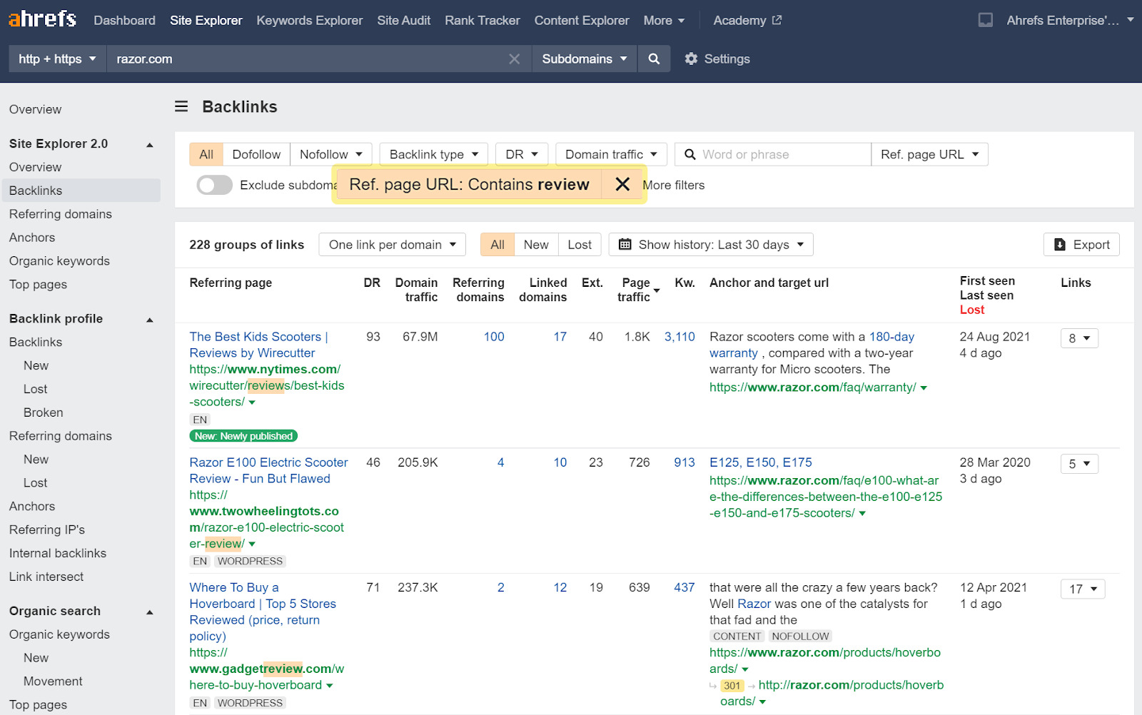 Insira o URL do seu concorrente no Site Explorer da Ahrefs, vá ao relatório de Backlinks, e filtre os resultados que referenciam URLs que contêm palavras como “avaliação”, “guia” ou “melhor”. Isto irá mostrar-lhe os websites que avaliaram o seu concorrente. A partir daqui, pode navegar através dos resultados e apresentar o seu produto a websites que se destacam para si.