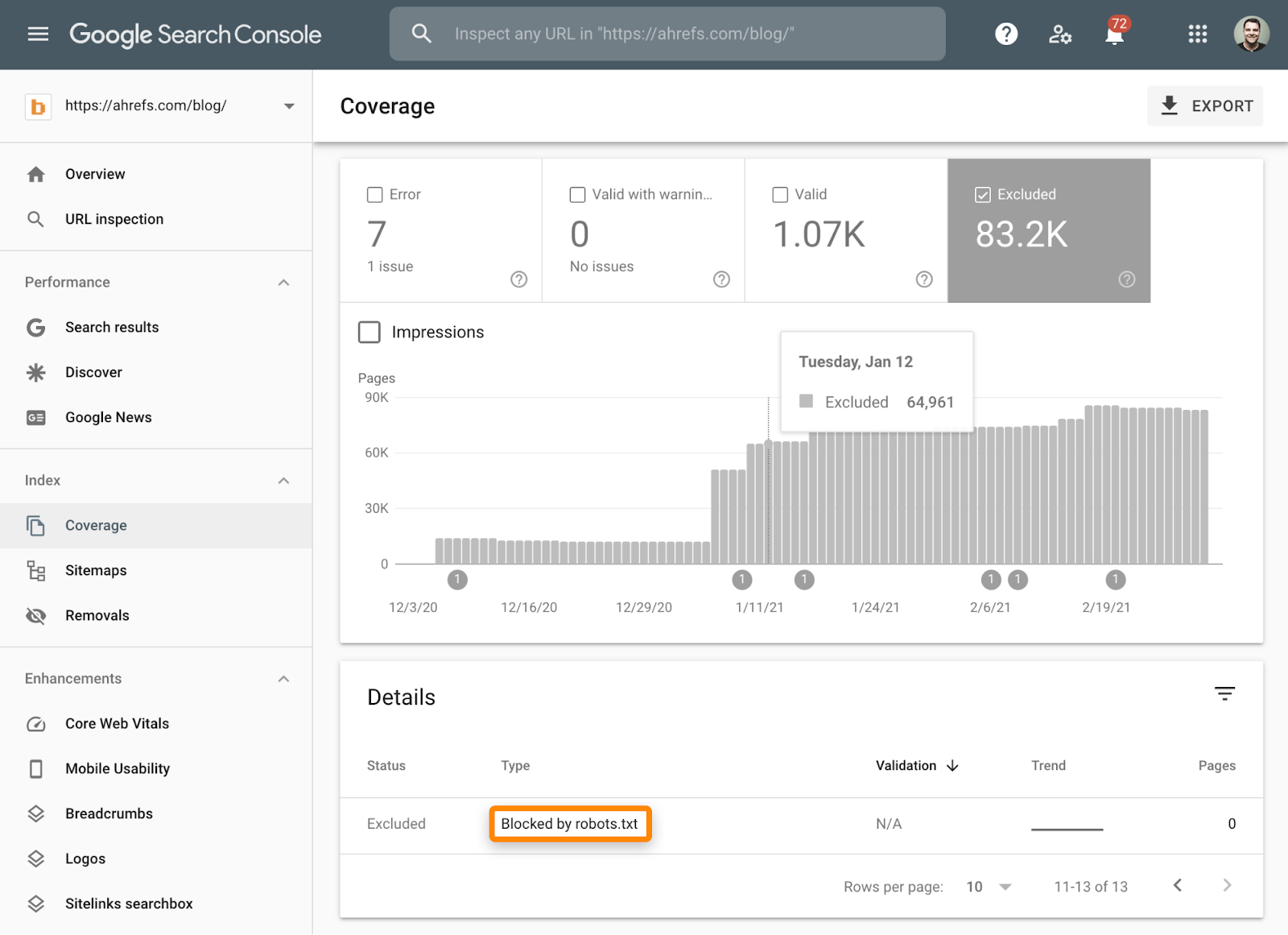 Este é outro motivo para se inscrever e enviar o seu website através do Google Search Console. Na verdade, ele indica se as páginas foram excluídas da indexação devido a bloqueios de rastreio no relatório de Cobertura.