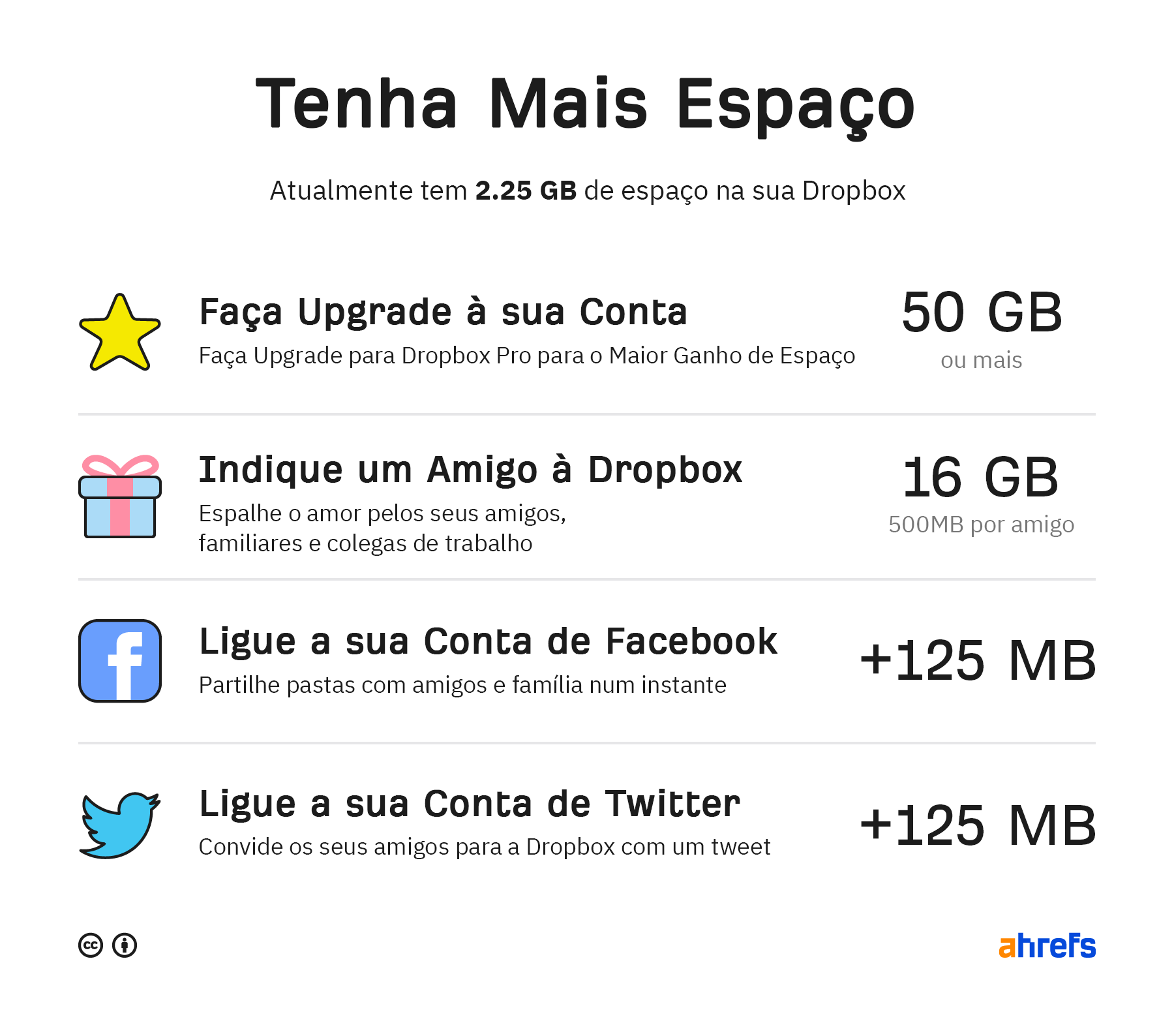 Para incentivos que não sejam em dinheiro, há uma variedade à sua escolha. Pode dar descontos ou crédito na sua loja, o seu produto ou muito mais. O exemplo mais famoso é o programa de referências do Dropbox. Eles transformaram todo o processo em jogo, oferecendo mais espaço de armazenamento por cada indicação bem-sucedida.