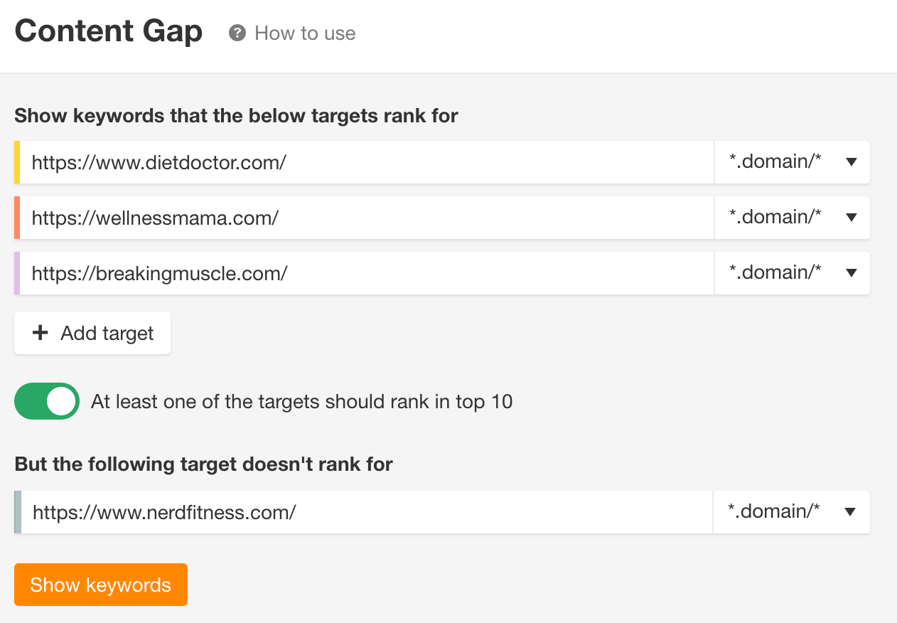 Em seguida, você deve encontrar um tópico para lançar com potencial de tráfego de pesquisa. A forma mais rápida de fazê-lo é executar uma análise de lacunas de conteúdo. Isso dirá para que tópicos o website que está a oferecer não está a classificar-se, mas websites semelhantes a este sim.