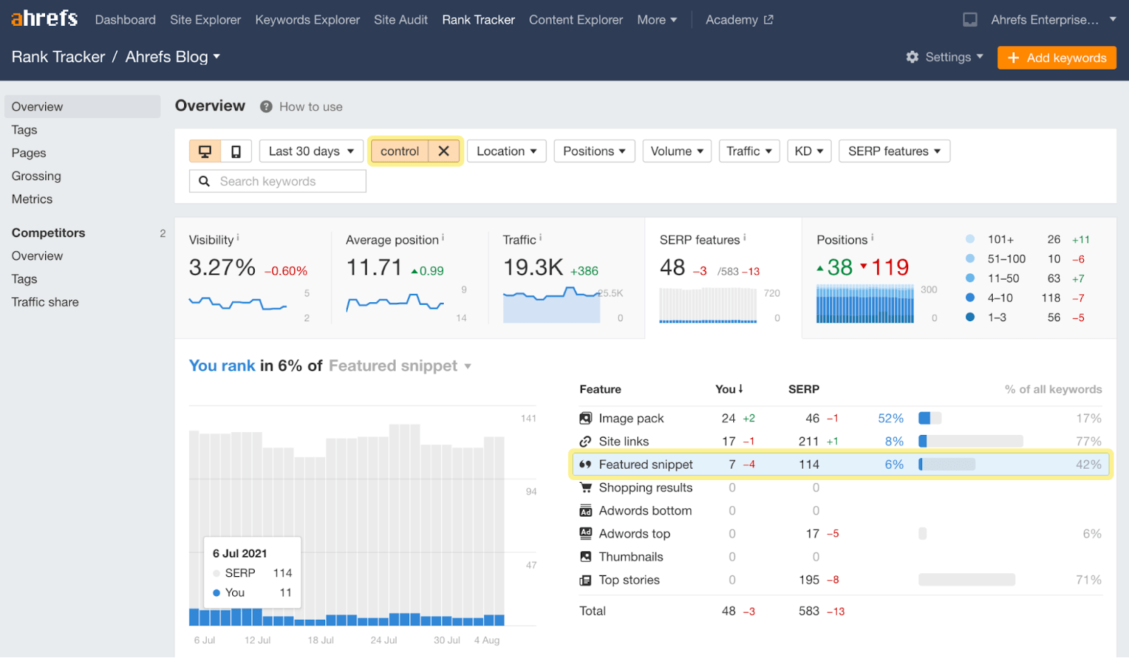 Use o Monitor de Posições da Ahrefs para comparar o número de trechos em destaque de propriedade para palavras-chave rastreadas em cada grupo nas datas de início e término do teste.