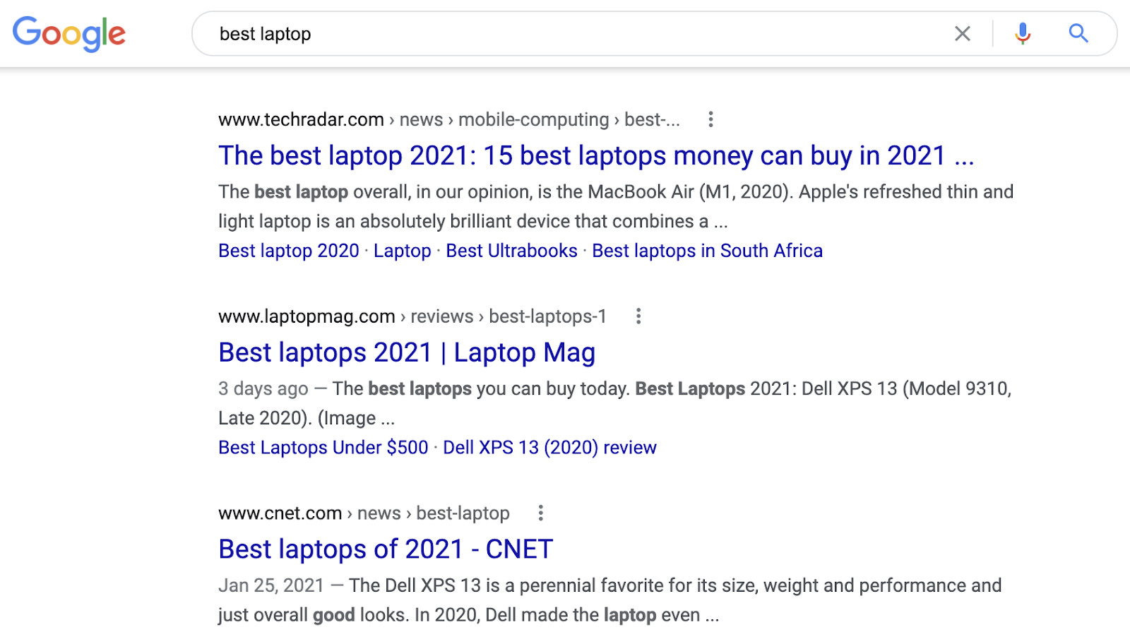 Por exemplo, o ângulo para “melhores portáteis” é claramente o quão recente é o conteúdo, visto que todos os resultados de pesquisa têm o ano atual no título.