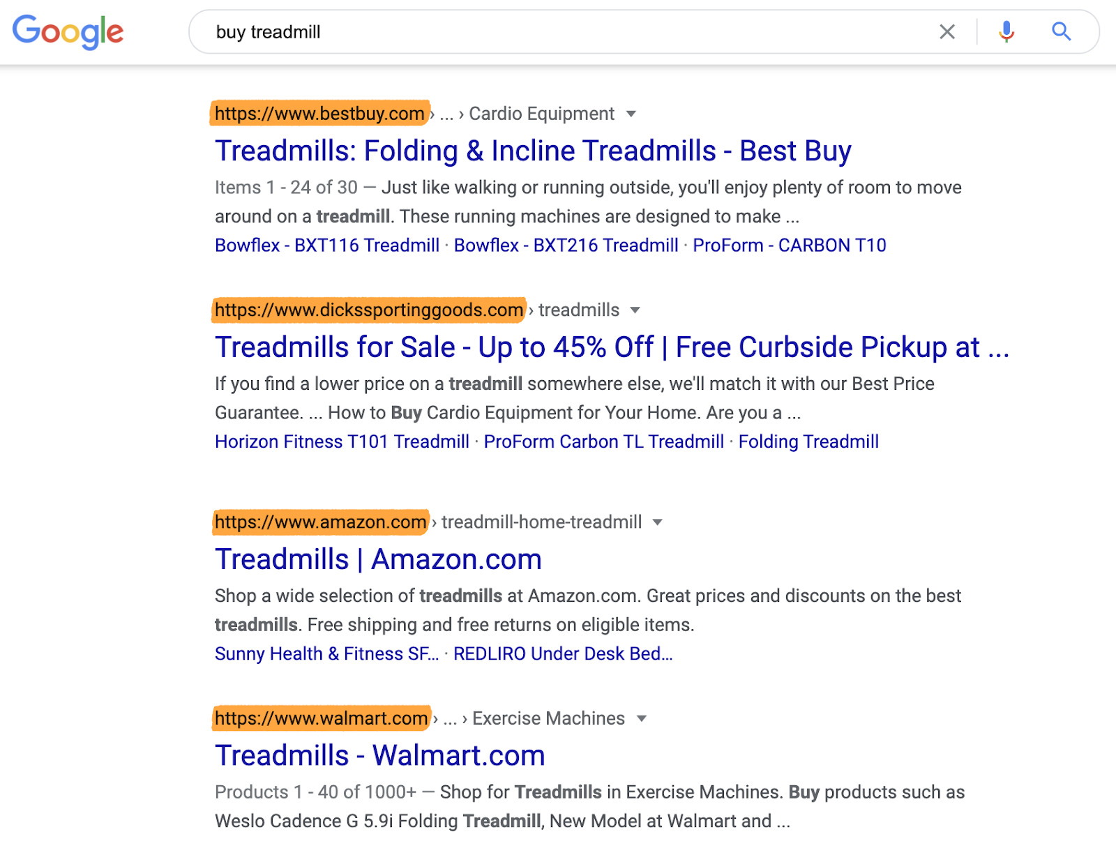 Olhando para os resultados da pesquisa, é claro que, mais uma vez, o Google percebe isto, porque todas as páginas posicionadas no topo são páginas de categoria de lojas online.