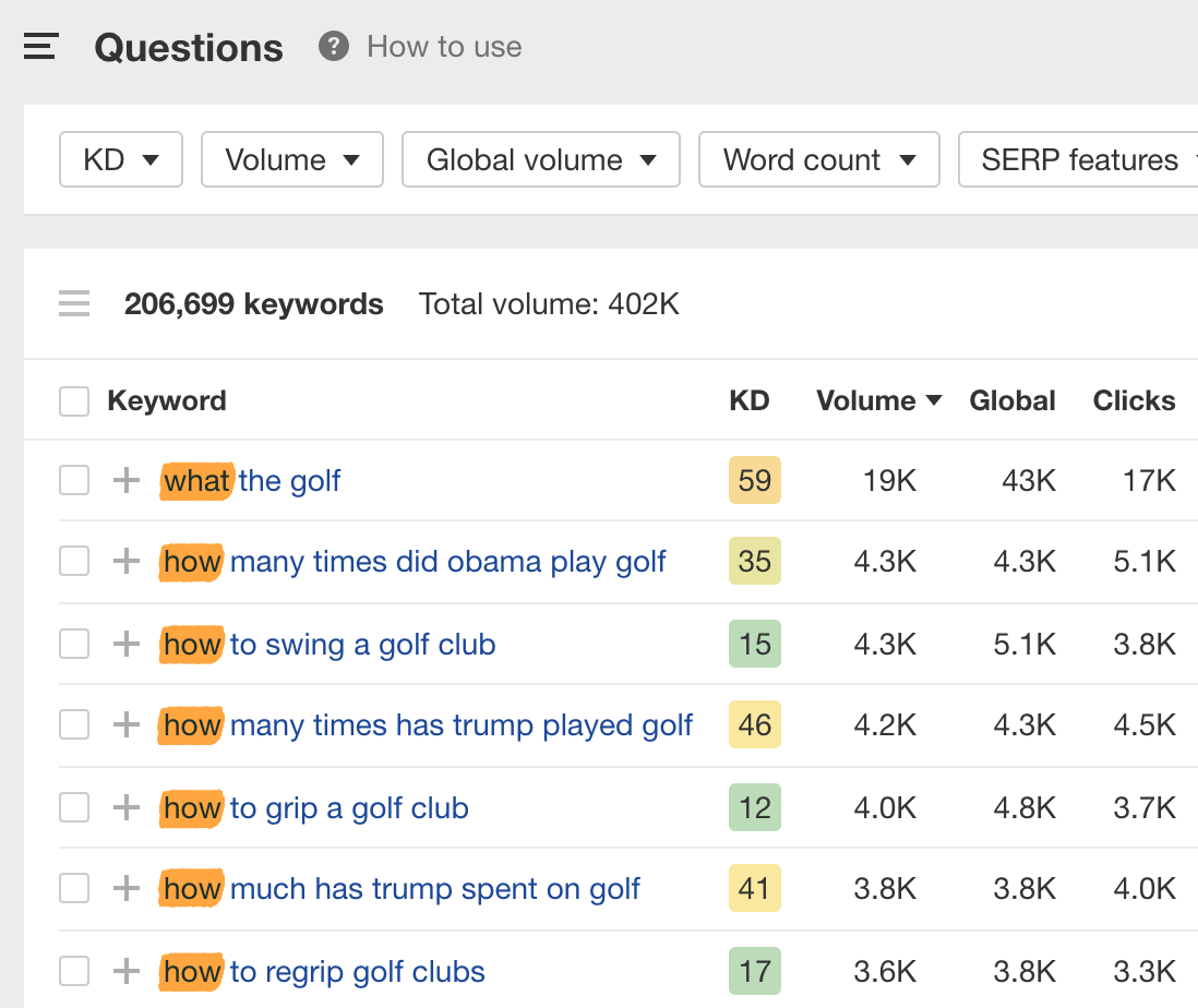 Se está à procura de palavras-chave informacionais, um método ainda mais rápido é usar o relatório Questões, que mostra palavras-chave fraseadas como questões (isto é, incluindo modificadores como “que”, “como”, “onde”, “quando”, etc.)