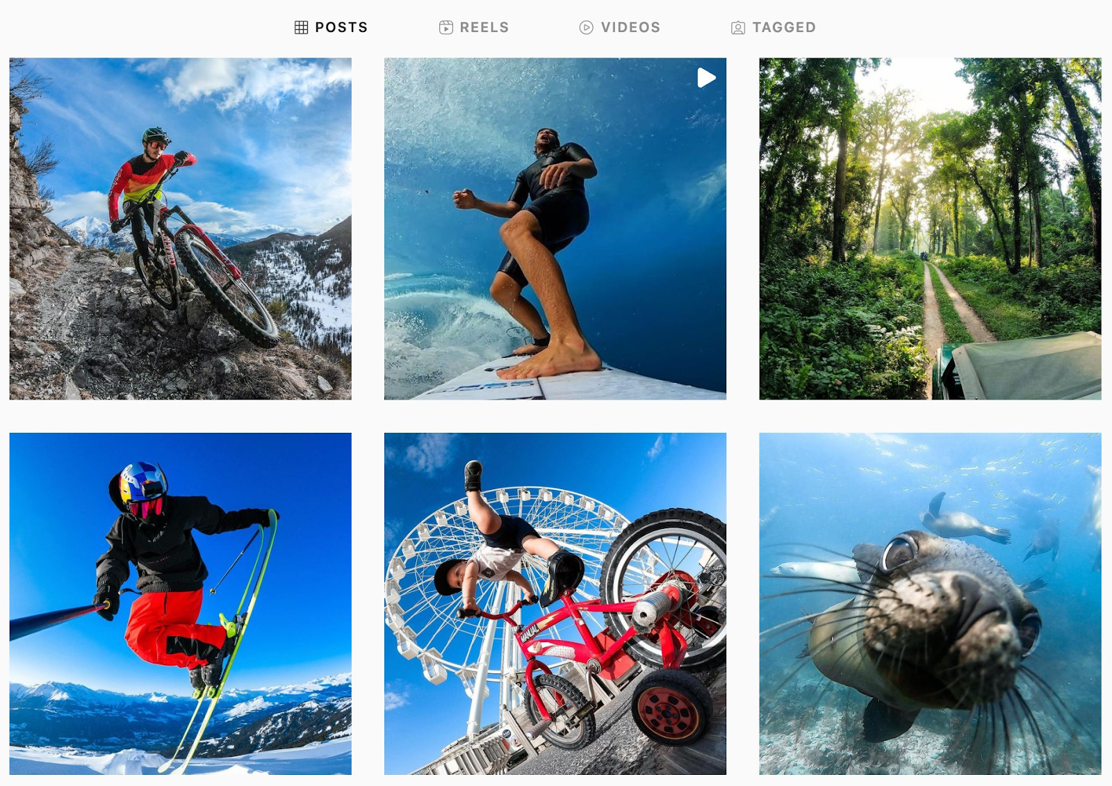 A GoPro sabe que o Instagram está relacionado com fotos imponentes e marketing de influenciadores. A marca combina com sucesso estes dois aspetos (e promove o seu produto sutilmente), selecionando fotos e vídeos vistosos feitos por clientes que usaram produtos com selo GoPro.