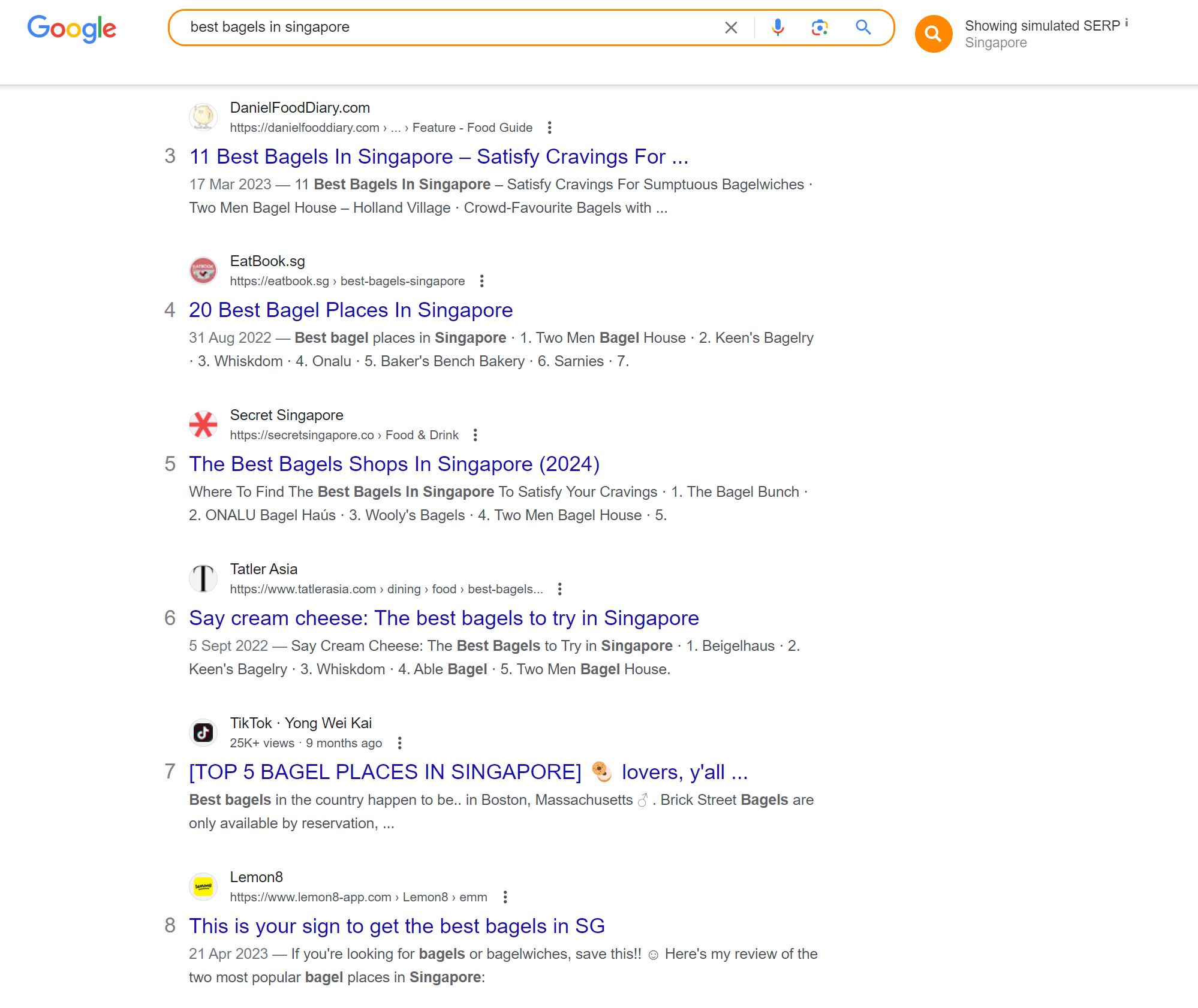 If you own a bagel joint in Singapore, you definitely want your website to rank in Google for “best bagels in Singapore.” But the pages that actually rank for this keyword are listicles, which give readers a bunch of different suggestions. So your job is to get featured in as many of those top-ranking listicles as possible.