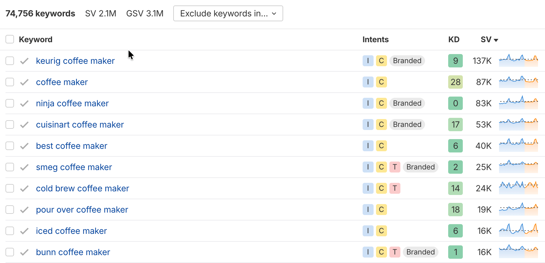 But not all secondary keywords are long-tail. “Coffee machine” has decent volume and isn’t particularly specific—but it’s still a secondary keyword relative to “coffee maker.”