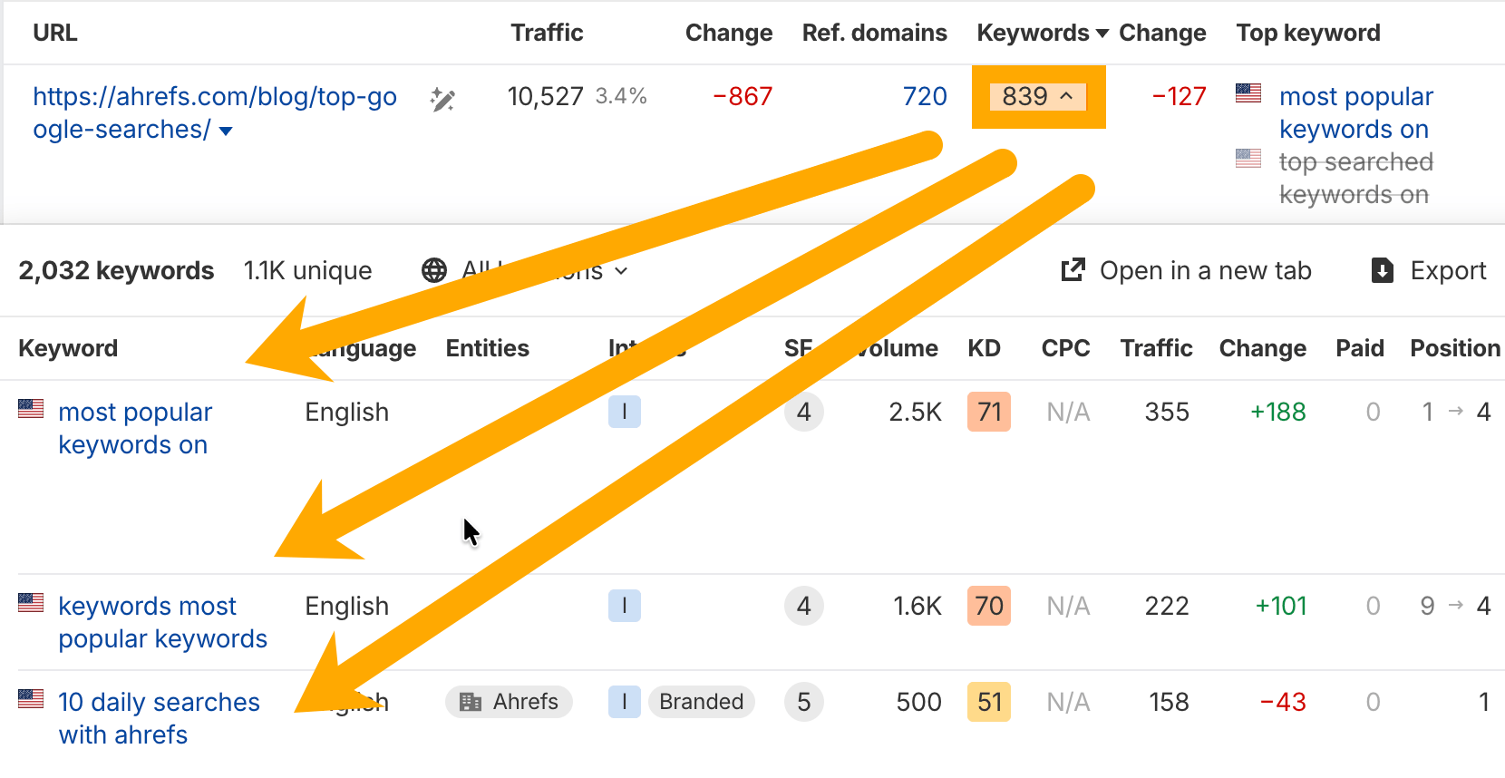 Go to Ahrefs’ Site Explorer and paste in the URL of a top-ranking page. Then head to the Organic keywords report. This shows you every keyword that specific page ranks for.