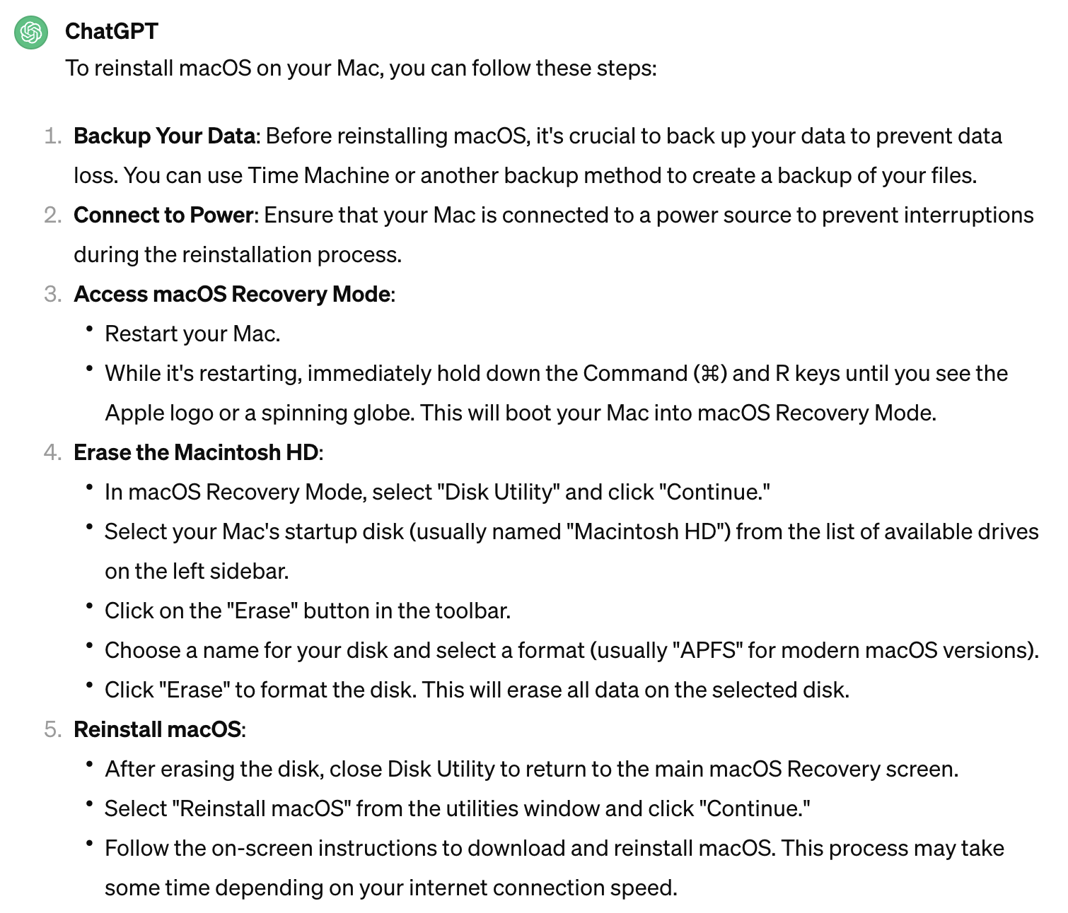 If you ask ChatGPT how to reinstall macOS, you can easily follow its instructions to get the job done. It clearly explains what you need to do and how to do it.