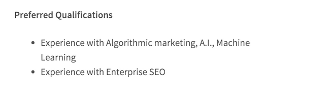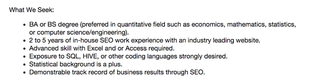 How would you know that SEOs need to know HIVE/SQL unless you read the job descriptions? Trip Advisor isn’t writing articles about “How they used HIVE in project X to grow their SEO traffic by Y%”.