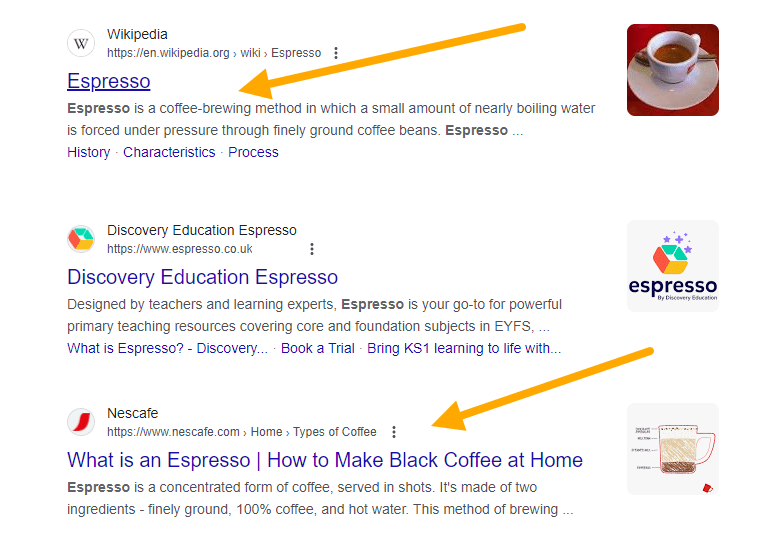 Most of the top results for “espresso” focus on definitions and simple explainers.