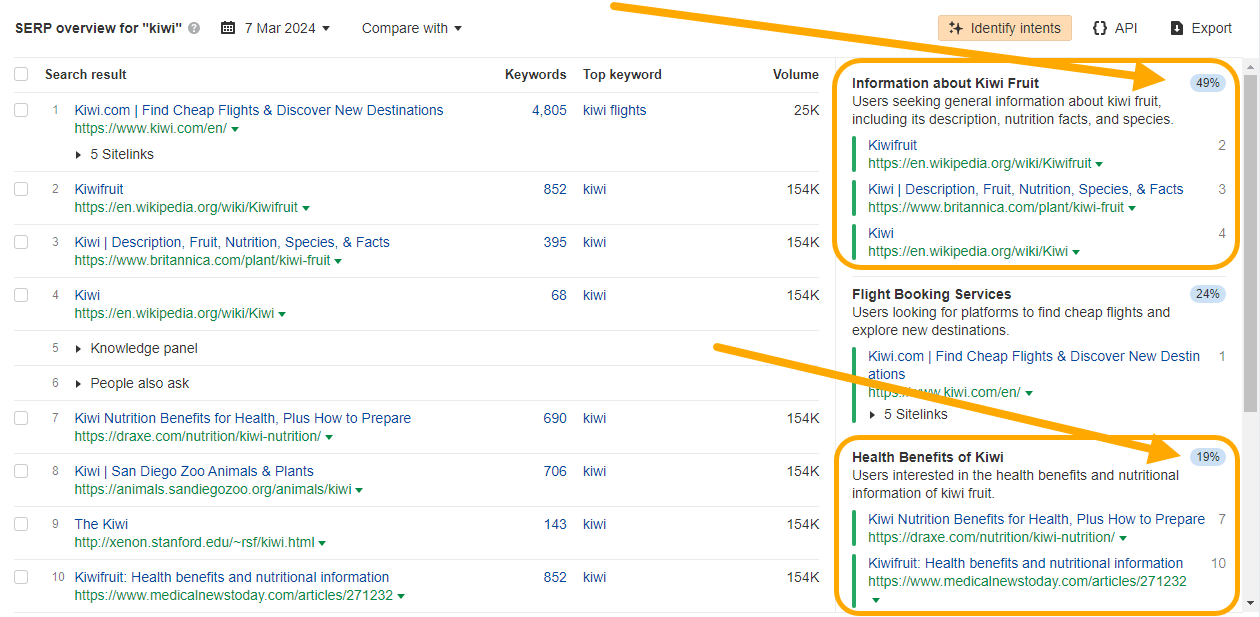 Some search results can contain several different types of intent (the SERP for “kiwi” includes the bird, the fruit, the airline company, and the Harry Styles song).