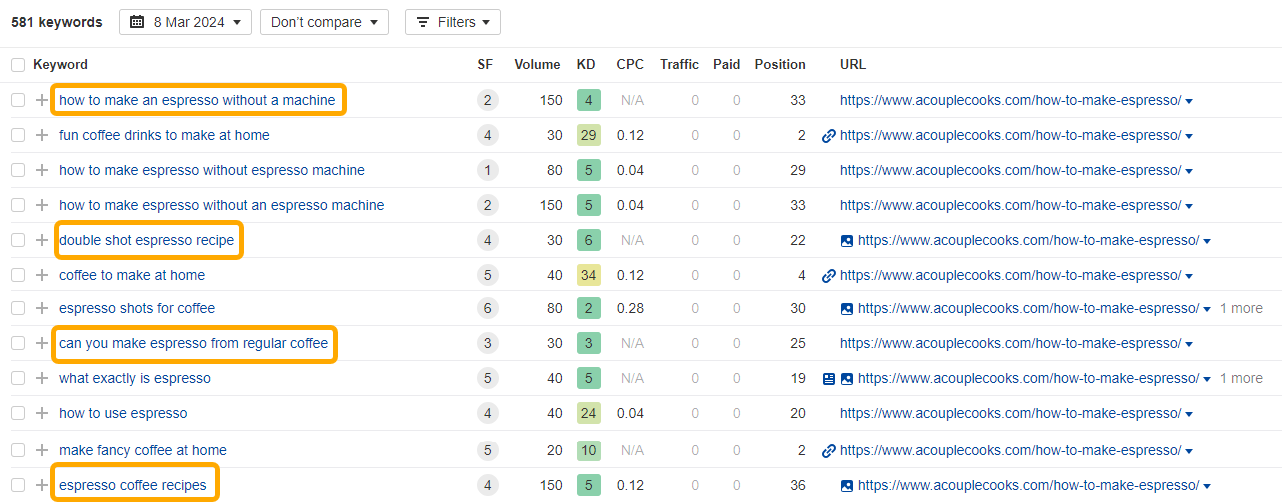 Or you can use Site explorer to look at the different keywords each article already ranks for. From this selection, it might be worth covering how to make espresso without an espresso machine: