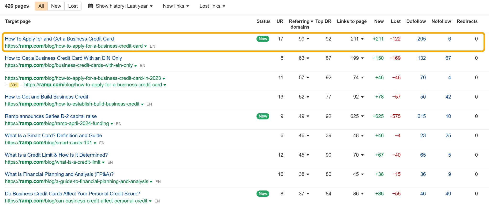 You can also see any website’s most linked-to pages using the Best by links report. Here, Ramp’s guide about how to apply for a business credit card has earned 211 backlinks from 99 different websites: