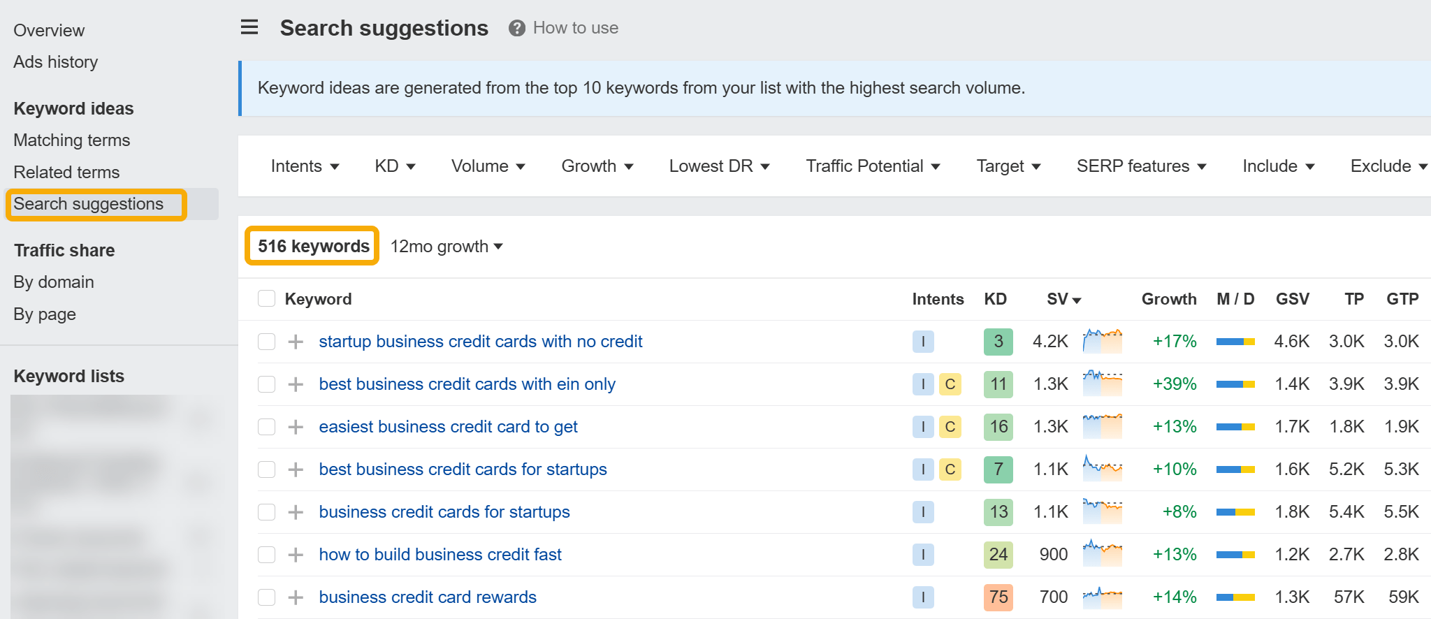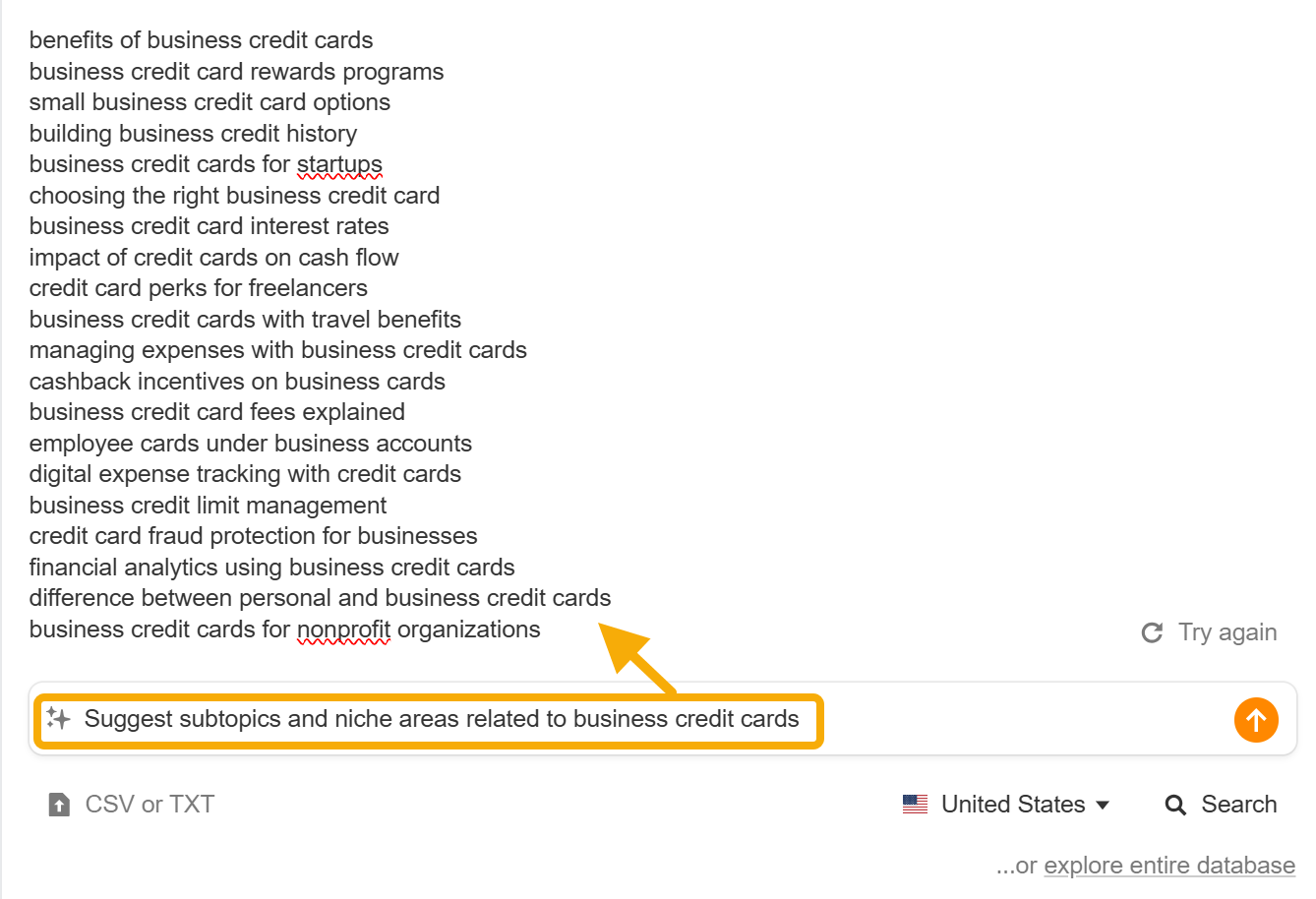 For a company like Ramp, that might be “business credit cards”. In our Keywords Explorer tool, you can use AI to help with this brainstorming process: