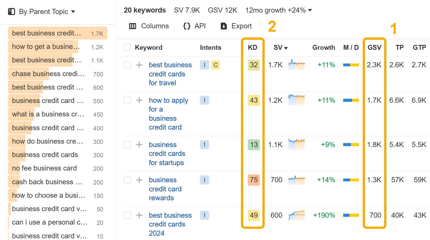 Hit “search”, and you’ll be able to see the estimated number of searches each keyword gets¹, and an estimate of how difficult it will be to successfully rank for the topic² (along with a bunch of extra data points):
