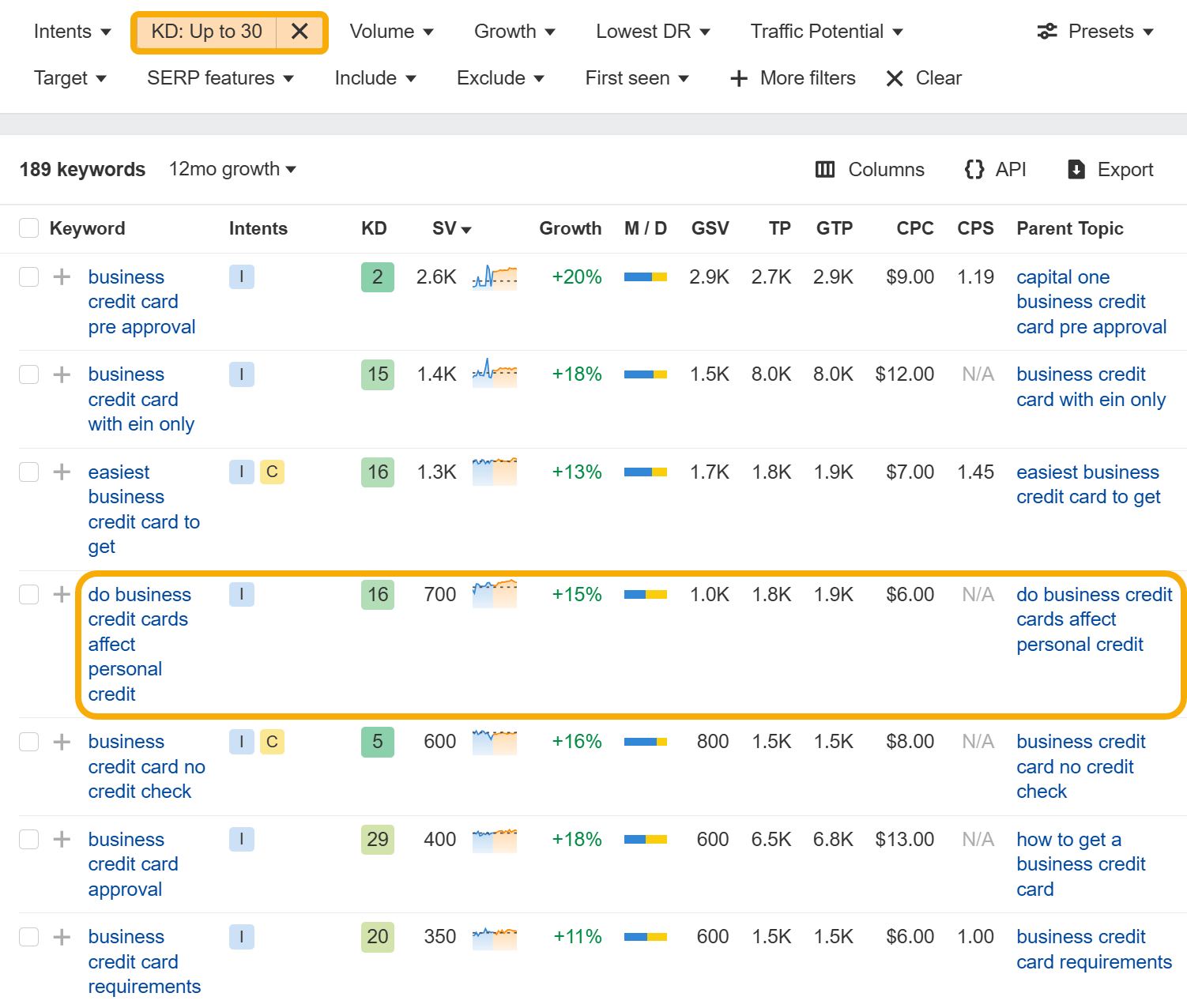 You can find these keywords in Ahrefs by filtering to show keywords with a low difficulty (say, up to 30):
