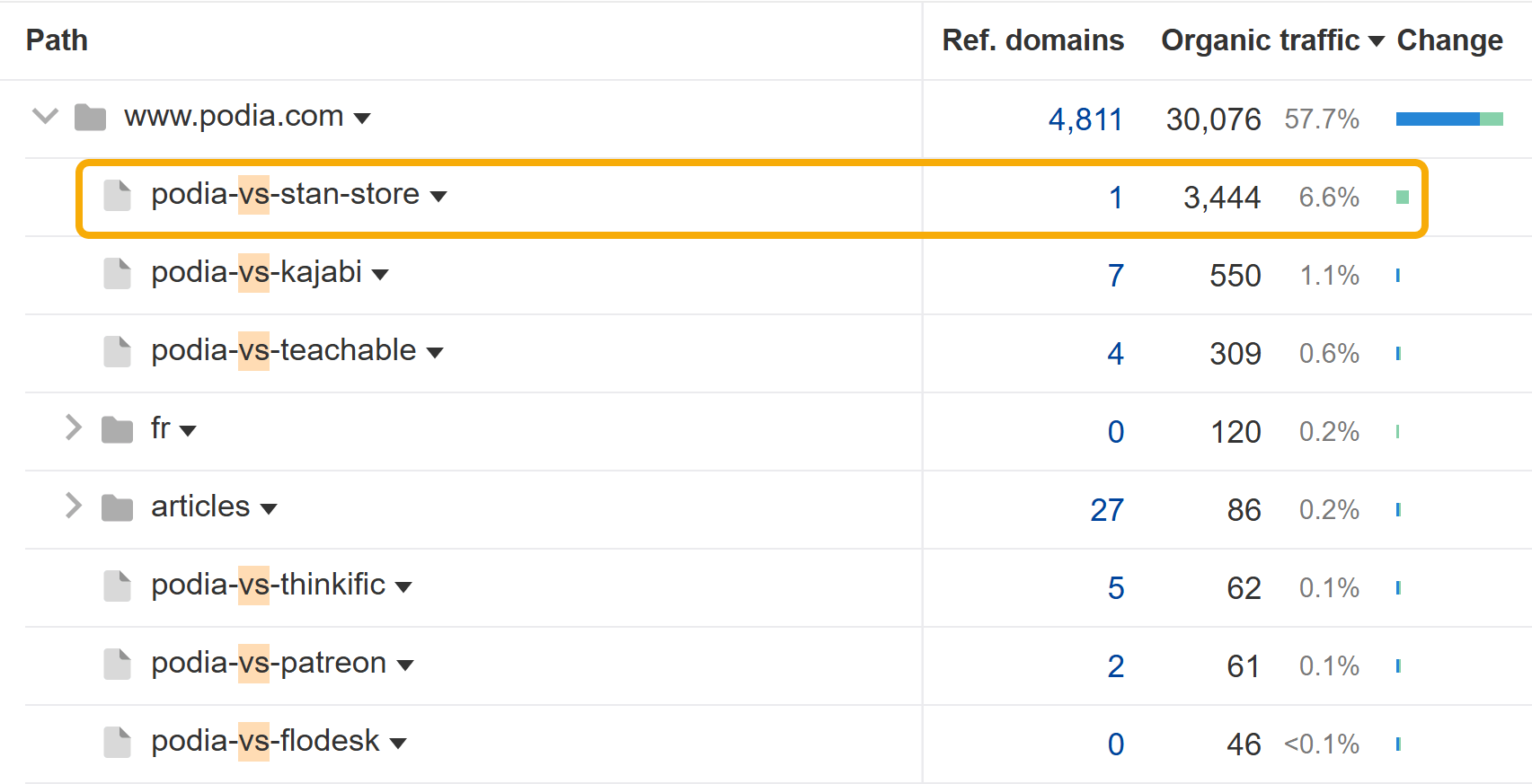 Here’s a list of Podia’s competitor comparison pages. Their comparison with Stan Store generates an estimated 3,444 organic visits to their website each month: