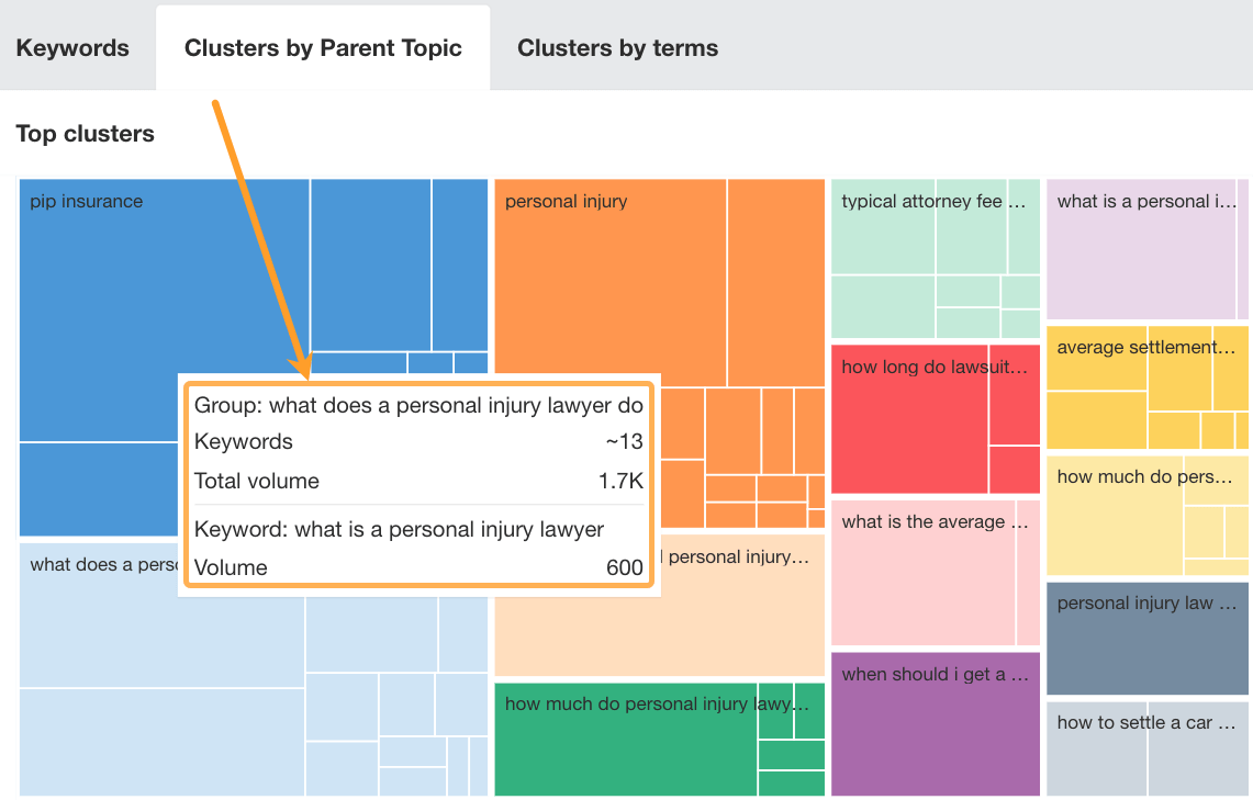 You can also easily see clusters of keywords for the top-of-funnel and mid-funnel questions people ask by checking the Clusters by Parent Topic report. It groups these keywords into similar themes and each group can likely be covered in a single article.