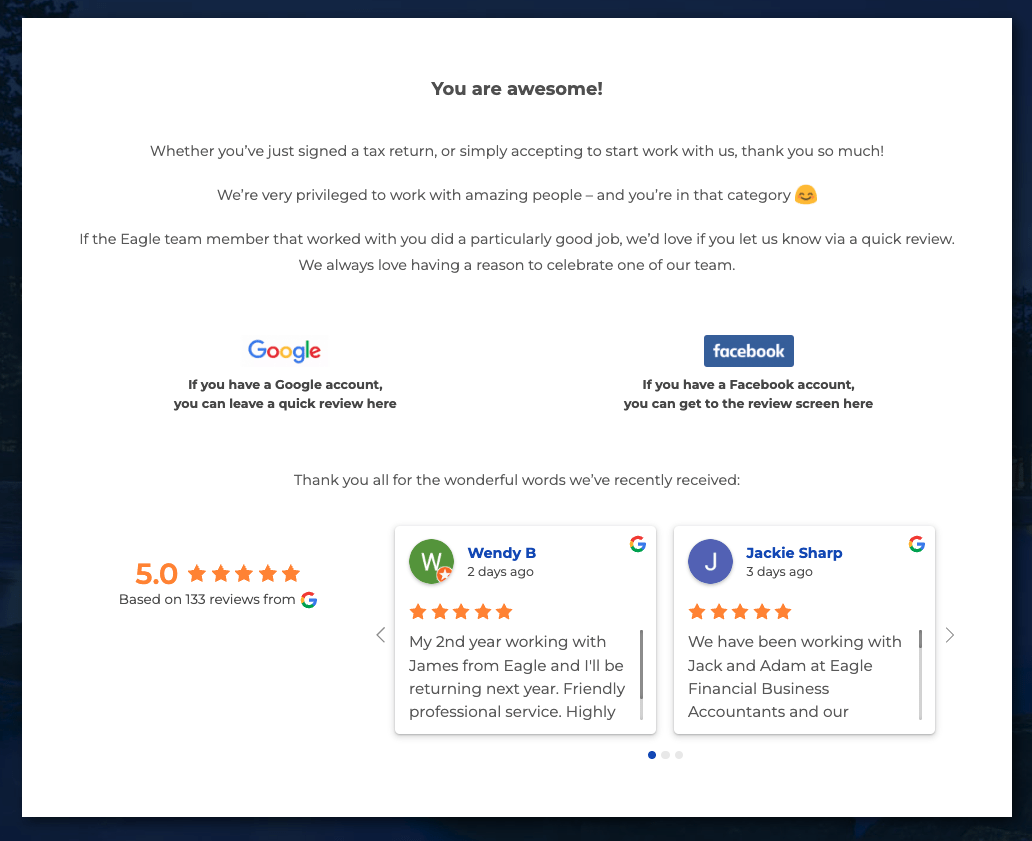 For instance, if you ever send an electronic contract or invoice out to clients, once they’ve signed or paid, you can send them to a thank you page that also asks for a review. Here’s my favorite example of this from a local accountant. You can emulate this concept for your own website too: