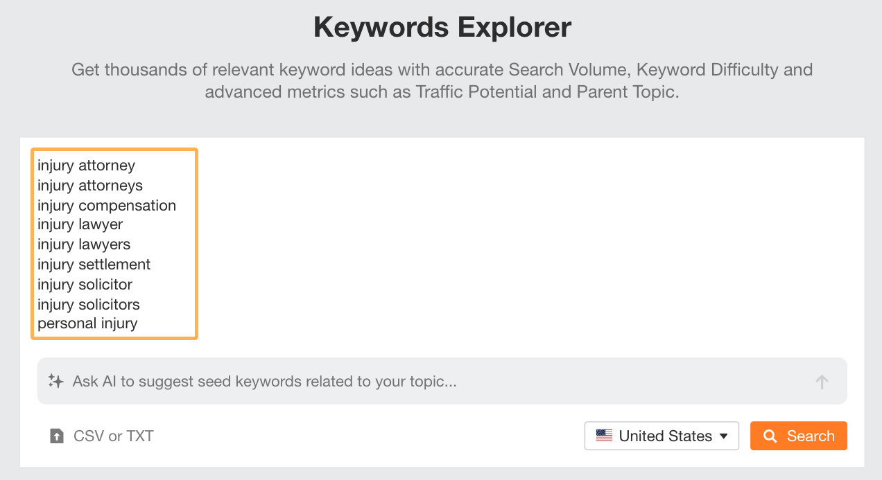 This pattern applies to most areas of law. To apply it to your website, enter your main practice area and a few variations into Keywords Explorer: