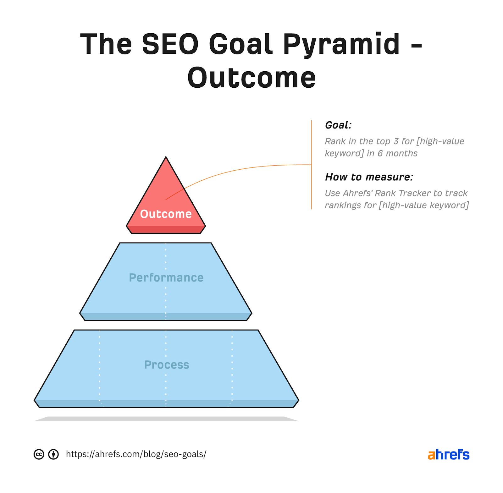 You can have one or multiple performance goals. What they are will depend on your outcome goal and bandwidth. Just be careful not to fall into that same trap of setting arbitrary goals like “increase backlinks.” This may help you achieve your outcome, but it isn’t SMART. There’s no way of knowing when or if you’ve achieved the goal.