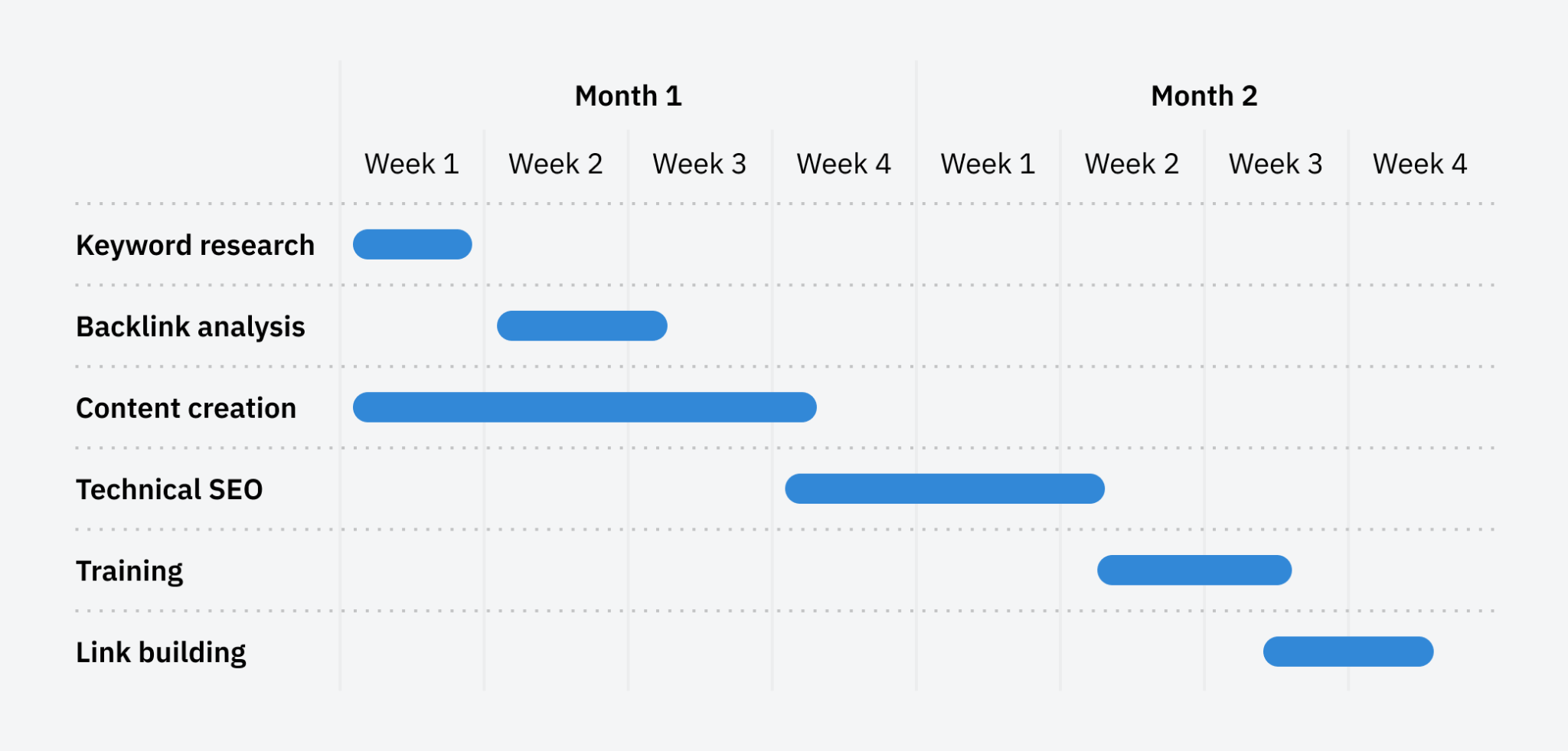 The best way to do this is to share progress through an SEO roadmap Gantt chart showing your total SEO campaign.