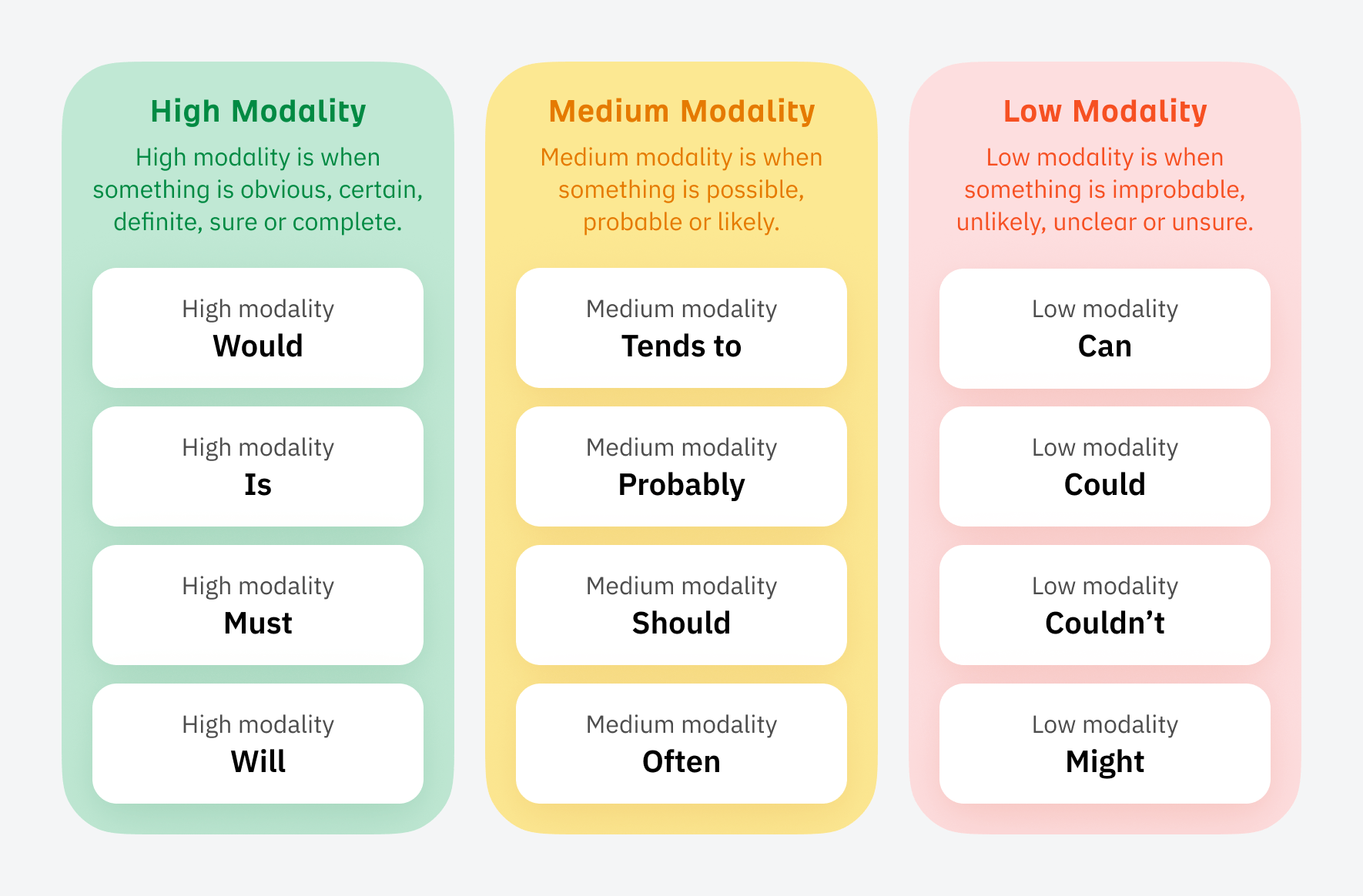 Lastly, use high modality language. It sounds complicated, but when you write your report, remember to use higher modality words like “would” and “will” instead of lower modality words like “could” and “might” when you think something is certain or likely.