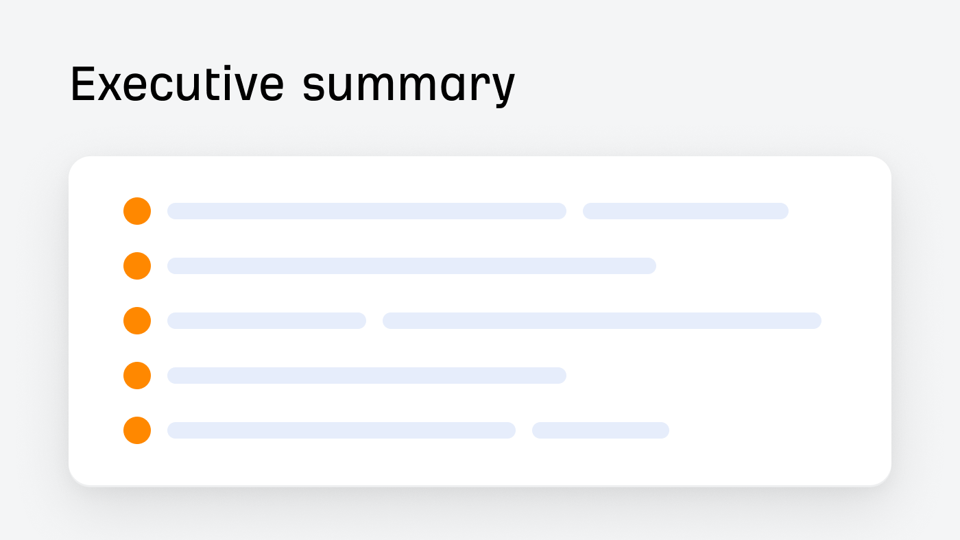 Executive summaries are designed for senior stakeholders who don’t have time to flick through a long report. They want to know the most important points. So you need to keep this section easy to understand.