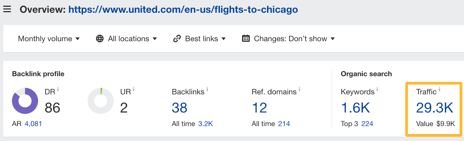 Another thing I saw quite often was optimized clusters showing the site’s inventory. For example, when people look for “flights to Chicago”, they’ll likely find United’s landing page displaying their flight options — 29.3k estimated visits each month.