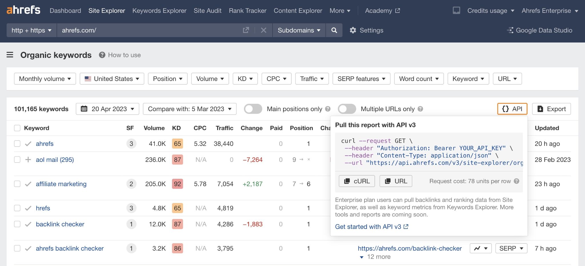 Use the API button in Ahrefs to get a sense for how API requests are structured. If you have access to the Ahrefs API, you can read our documentation and even make free practice requests.