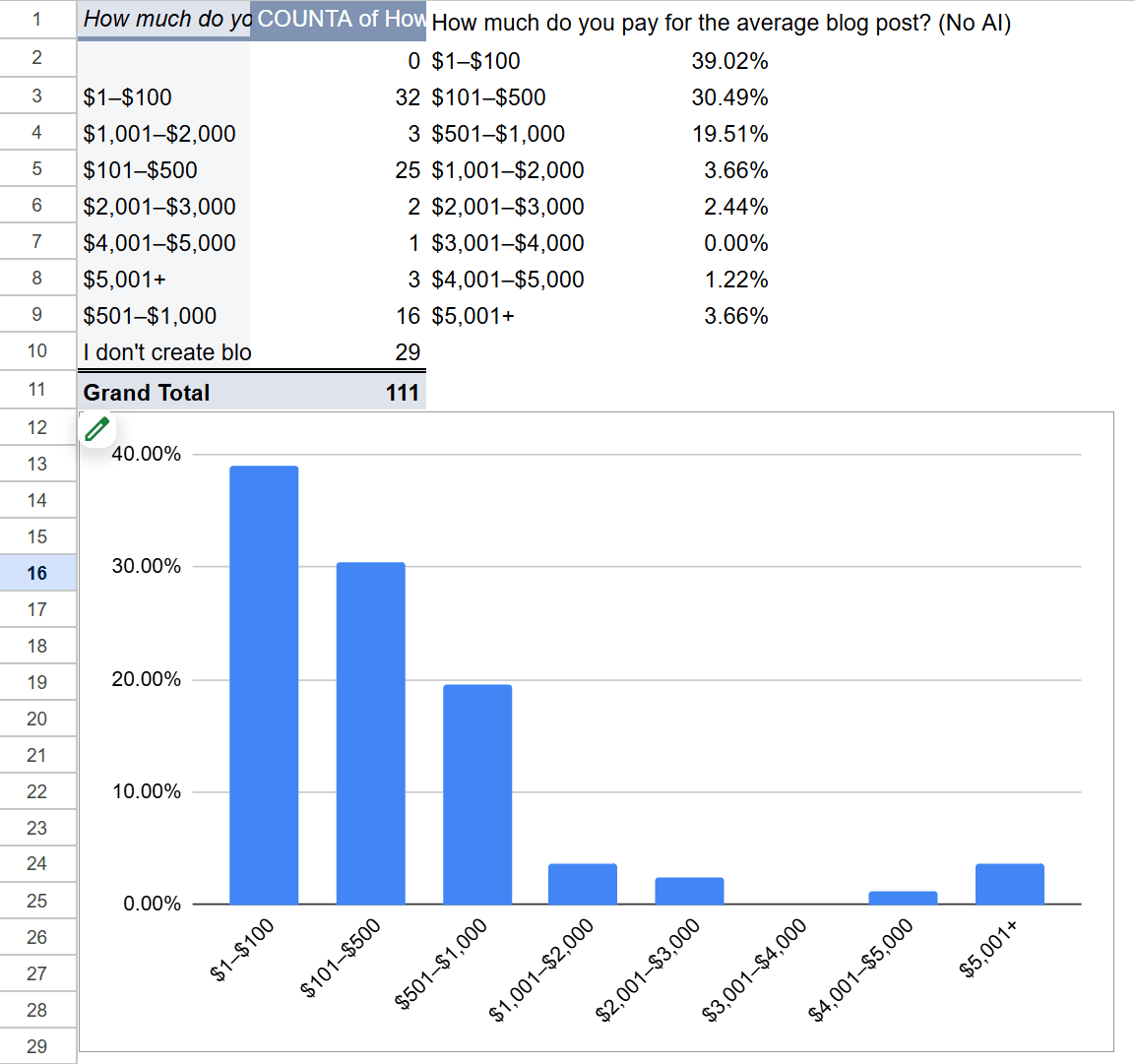 Here’s a real pivot table from our recent AI in content marketing survey. The pivot table turns tons of unwieldy data into specific, useful analyses.