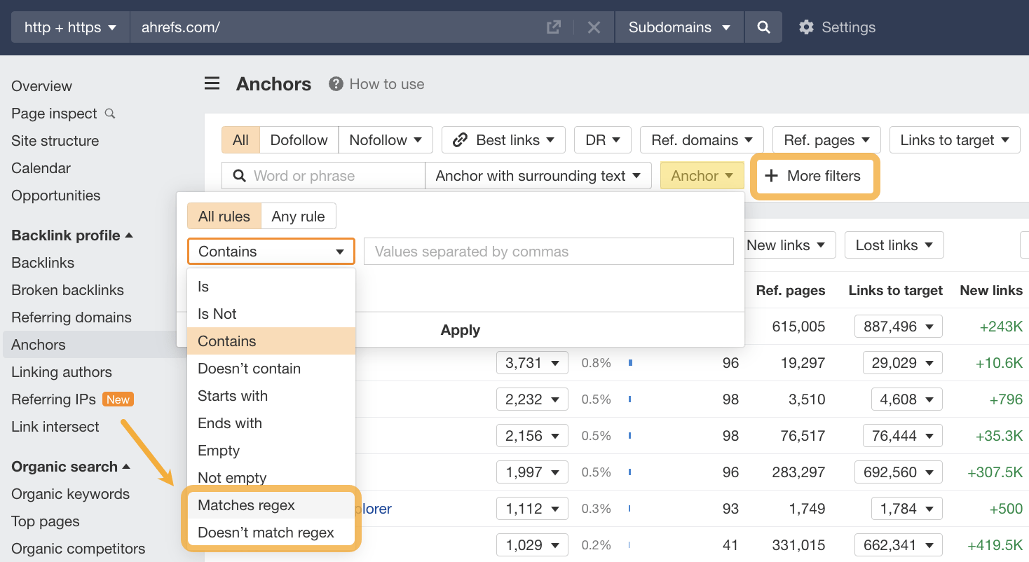 I’ve used regex to clean UTM parameters, extract domain names from referral URLs, filter URL lists to find just international subfolders, validate email formats, and even pull keywords from content briefs. It’s especially useful for filtering in Ahrefs: Site Explorer and Site Audit both accept regex queries: