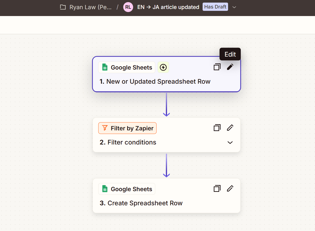 Here’s a super simple Zap that syncs changes in our master content spreadsheet with spreadsheets for each of our international blogs—in this case, notifying the Japanese marketing team that new articles are ready for localization:
