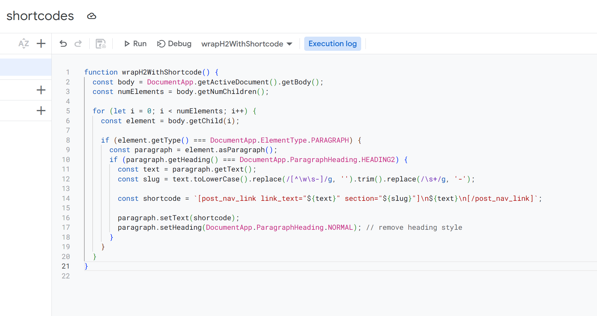 Apps Scripts also work in Google Docs. Here’s a simple script that I run to automatically add WordPress shortcodes into my finished drafts. ChatGPT wrote the script in about ten seconds flat, and this saves me about ten minutes per article draft:
