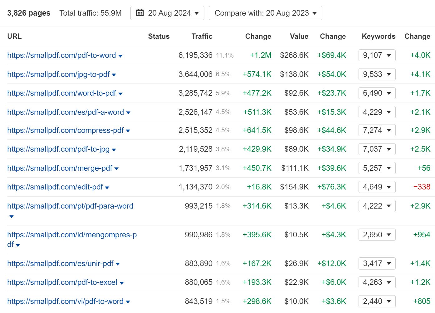 Smallpdf’s traffic growth comes entirely from—you guessed it—free PDF tools. Conversion tools (converting from PDF to Word Doc, from JPG to PDF, and so on) drive the majority of the site’s traffic: