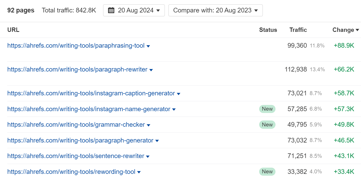 Our paragraph rewriter (113k visits per month), paraphrasing tool (99k), and instagram caption generator (73k) are particularly popular: