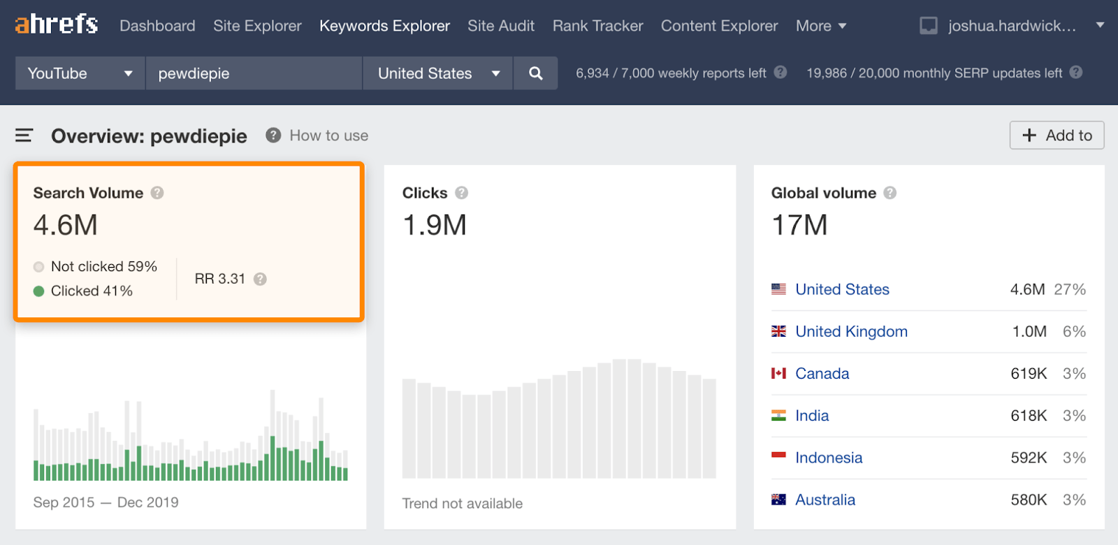 You can find YouTube search volumes for 371 million keywords with Ahrefs’ Keyword Explorer.