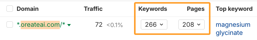 In total, Oreate AI ranks for 266 magnesium glycinate keywords across 208 pages. 200 times Healthline’s content creation efforts for a tenth of the keywords (give or take).