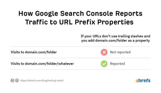 Reporting should be considered when determining whether to use a trailing slash or not. For instance, in Google Search Console, you can set up either a domain or URL prefix property. If you don’t include the trailing slash when setting up a URL prefix property (e.g. domain/folder), Google adds one anyway. As a result, all visits to domain.com/folder (without the trailing slash) won’t be reported because domain.com/folder/ (with trailing slash) is a level higher.