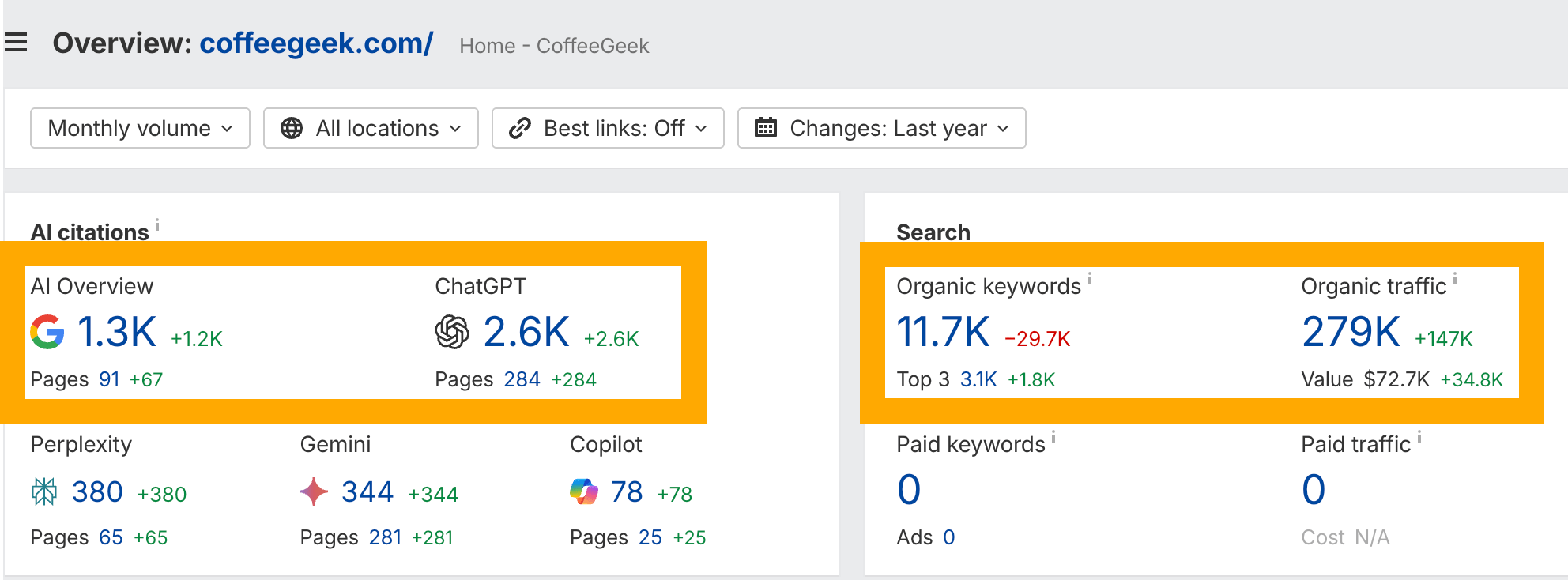 coffeegeek.com ranks for tons of coffee-related keywords… and also appears in tons of AI conversations about coffee.