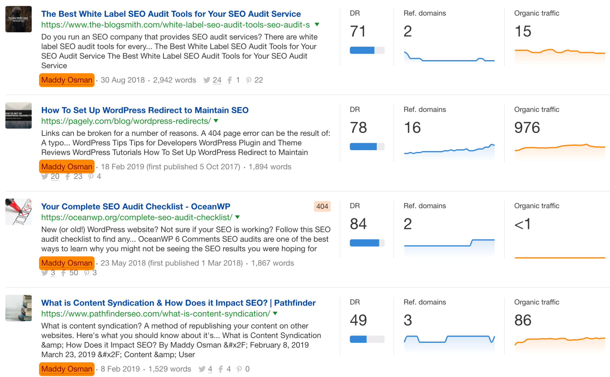 For example, one SEO task this is useful for is finding guest post opportunities. Just search for a topic, then click on the total pages number for an author who’s been published on numerous websites.