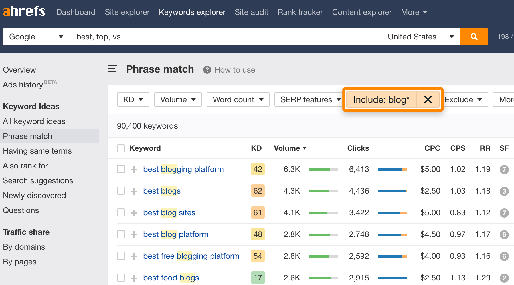 For example, you can add “blog*” into the “Include” box to filter for all variations, including “blogging”, “blogger”, “blogs”, etc.